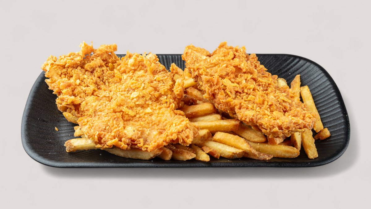mit Pommes frites, Handcut-Pommes frites, Süßkartoffel-Pommes, einem Salat deiner Wahl, zartem Hähnchenbrustfilet, frisch paniert und knusprig gebraten