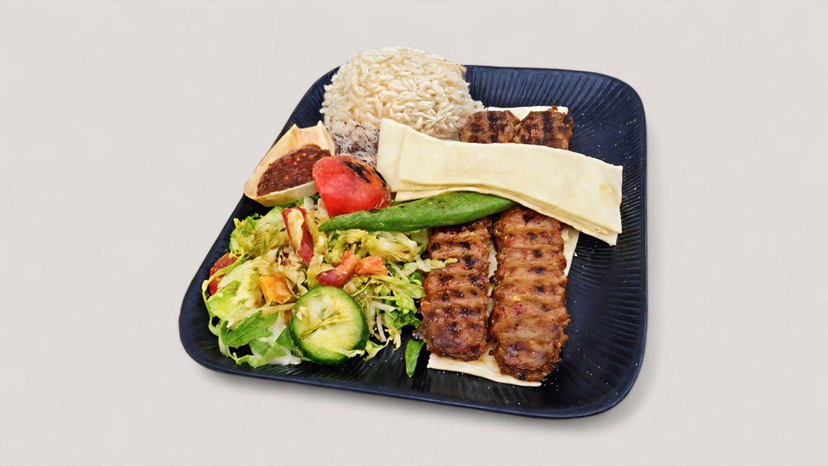 Adana Teller Double, 2 gegrillte Hackfleisch Spieße mit Basmati Reis, angemachte Zwiebel, Salat, gegrillte Tomaten und Fladenbrot