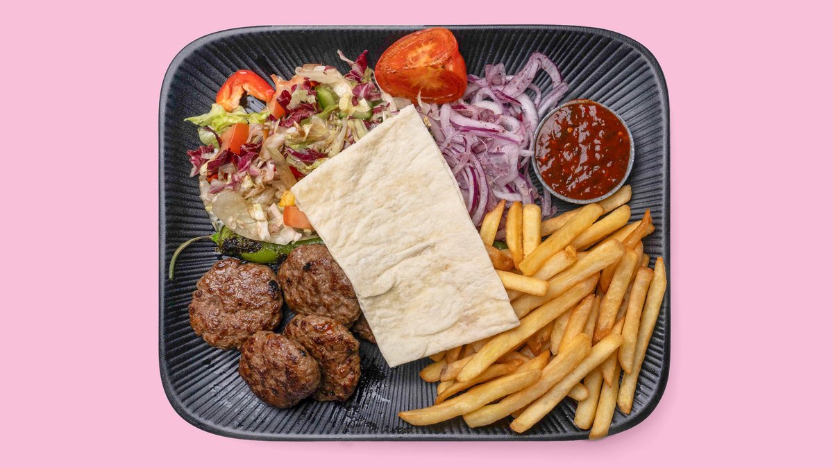 Köfte 300 gr. mit Pommes, Spezial Sauce, angemachte Zwiebel, Salat, Peperoni und Fladenbrot