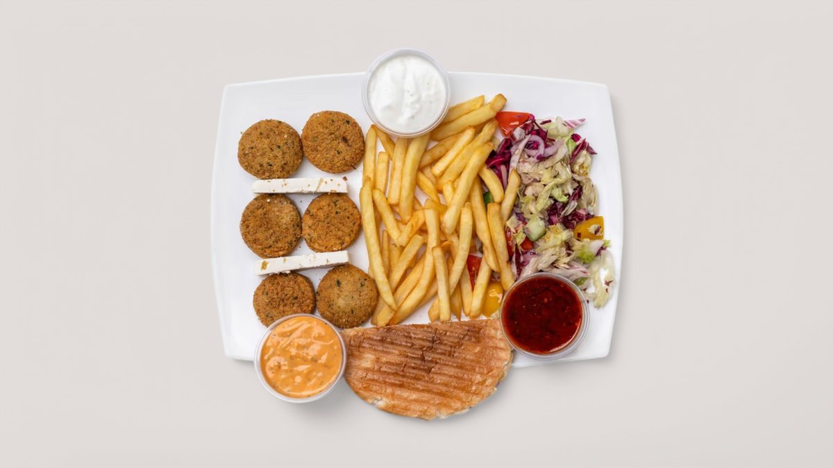 Falafelteller mit Pommes, Hirtenkäse, Joghurtsauce ohne Knoblauch