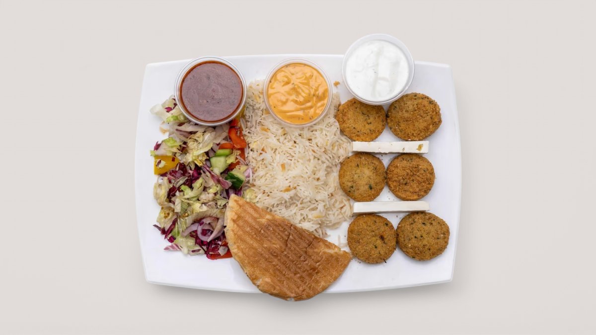 alle Gerichte werden mit Tomaten, Joghurtsoße und Hirtenkäse serviert und alle Falafel-Teller werden mit Salat, Zwiebeln, Blaukraut, Rucola, Radicchio und Eisbergsalat serviert
