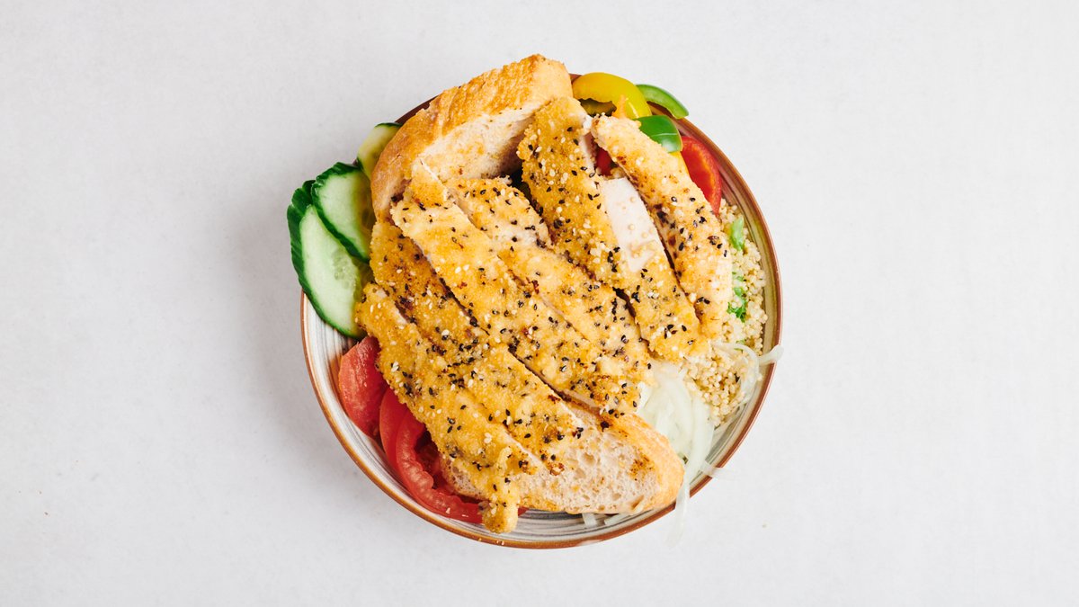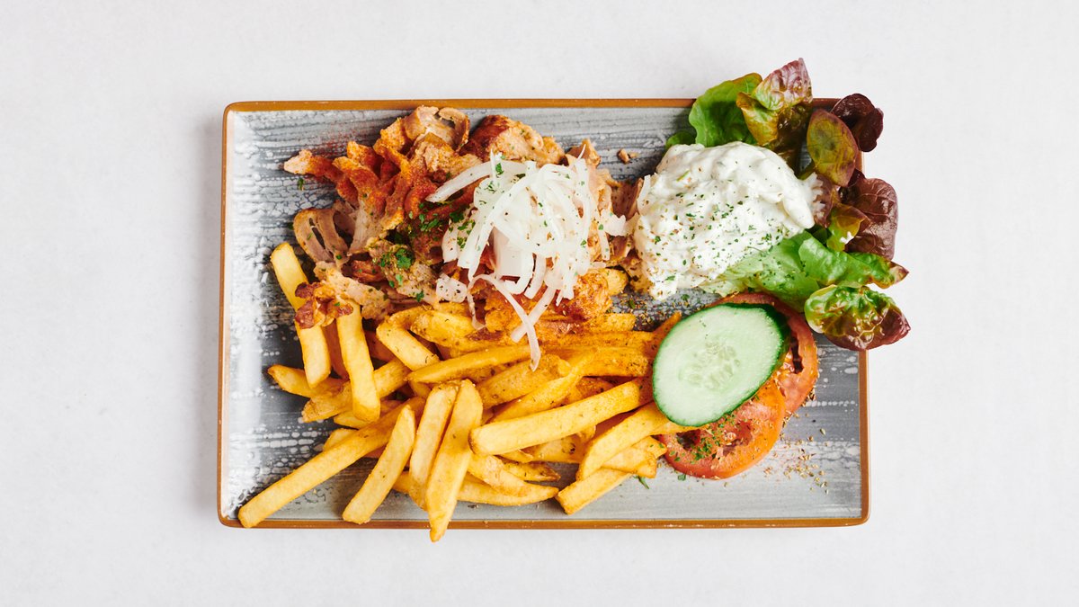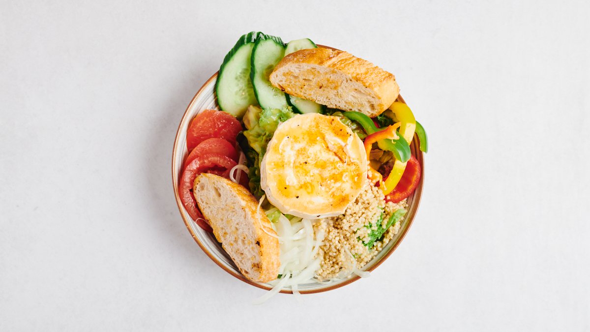 alle Gerichte werden mit Tomaten, Gurken, Zwiebeln, Salat, Paprika, Quinos und Honig-Senf-Dressing zubereitet