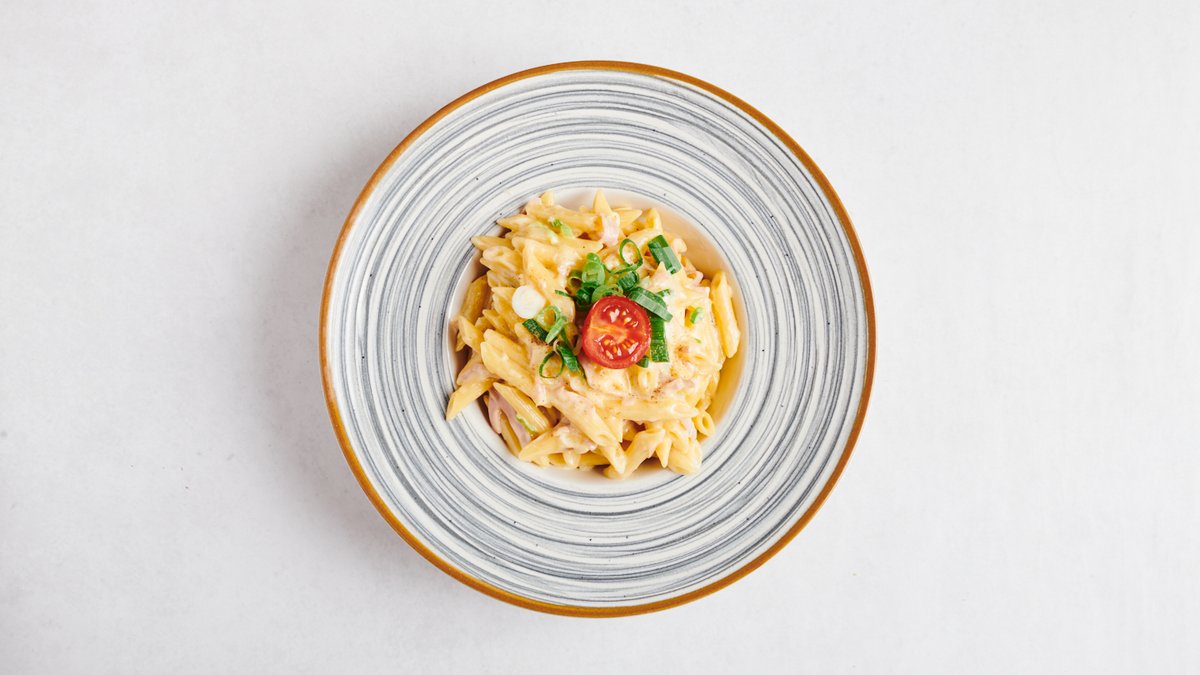 mit Kirschtomaten, Frühlingszwiebeln, Schafskäse und Basilikum-Pesto