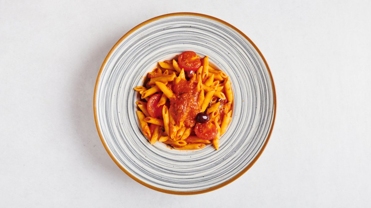 mit Peperoncino, Knoblauch, Oliven und Tomatensoße