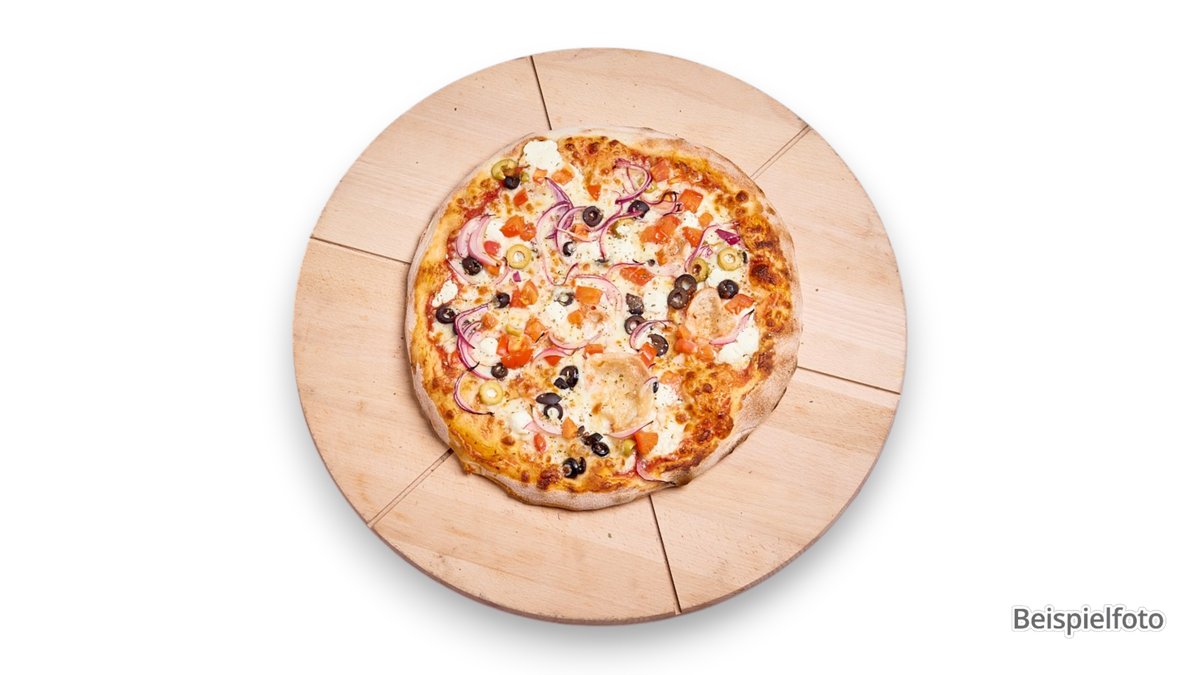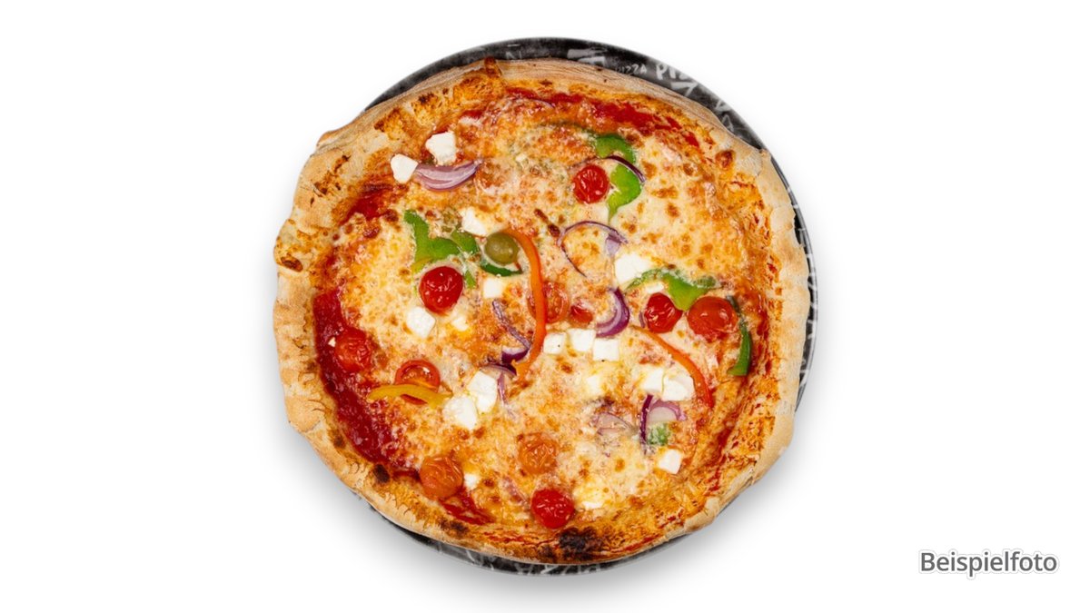 mit Tomatensoße, Mozzarella, Schafskäse, Zwiebeln, Paprika, Oliven und Speck vom Schwein