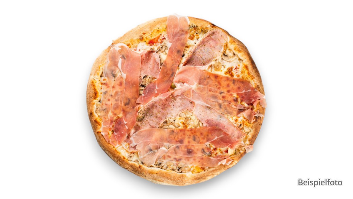 mit Tomatensoße, Mozzarella, Champignons, Brie, Speck vom Schwein und Parmigiano Reggiano