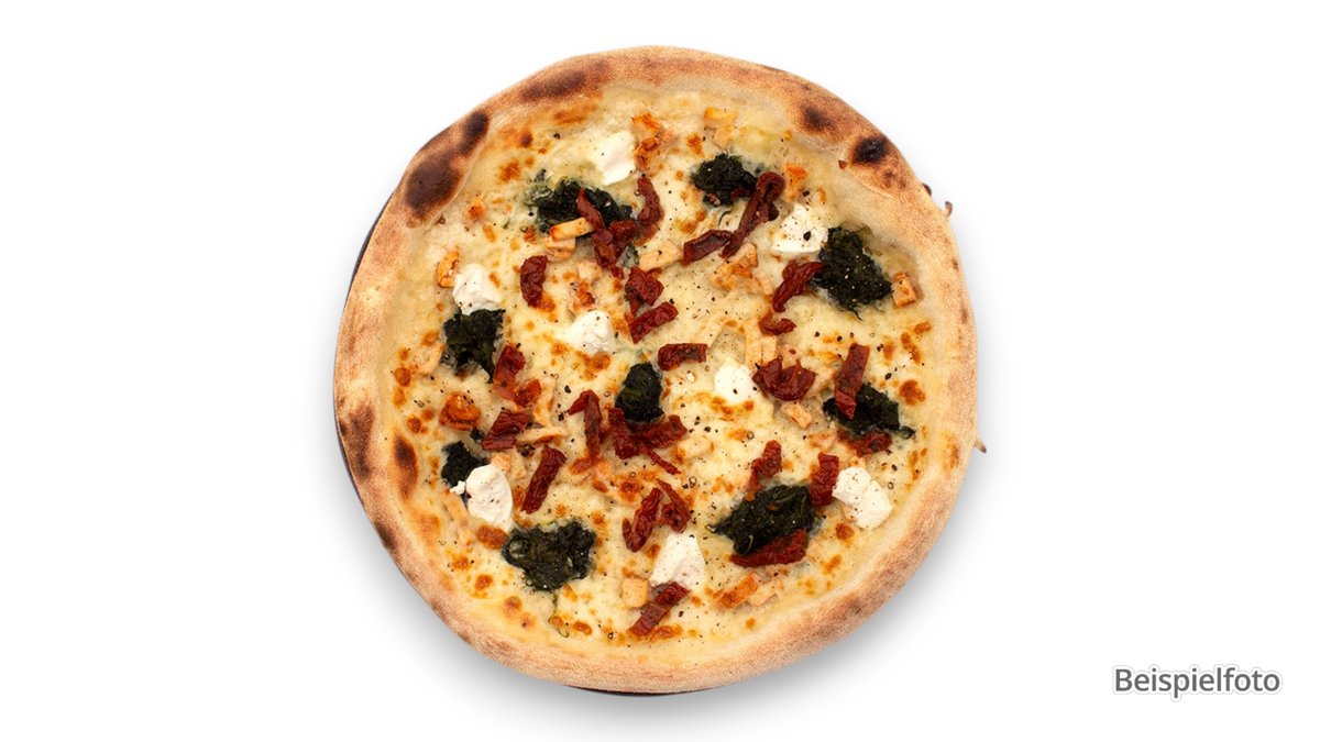 mit Tomatensoße, Mozzarella, Spinat, Gorgonzola und Speck vom Schwein