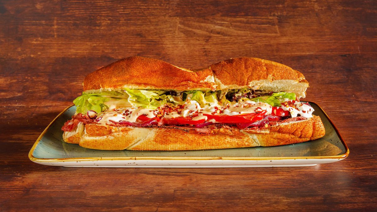 scharf mit Pastrami vom Rind, Burrata, Salat, Zwiebel-Chutney, gegrillter Paprika, Chili und Chipotle-Soße