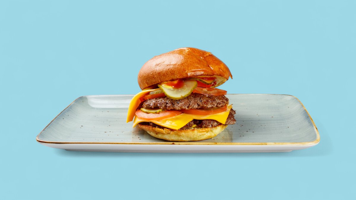 mit 2x ca. 80 g Rindfleischpatties, Käse, eingelegten Gurken, Zwiebeln, Ketchup und Senf