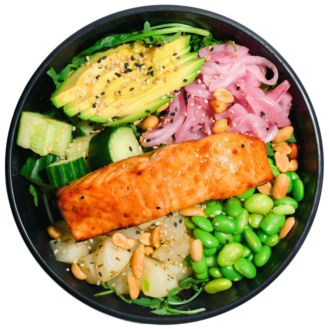 mit Miso-Lachsfilet, Avocado, Edamame, gerösteten Erdnüssen, Rosmarin-Birnen, Gurken, eingelegten roten Zwiebeln, Rucola und Basmatireis