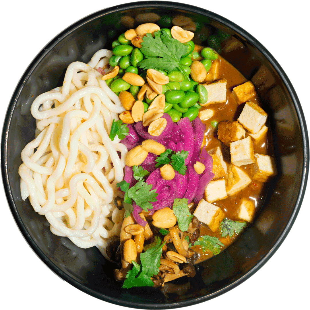 Bio-Tofu in Erdnusssauce, Edamame, rote Zwiebel, Miso-Buchenpilz, geröstete Erdnuss, Udon-Nudel, Koriander