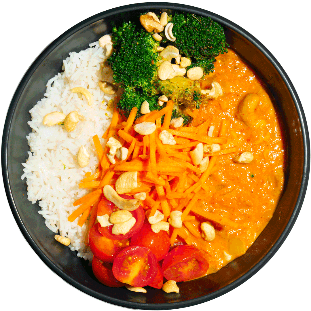 Butter Chicken, Cherrytomate, Cajun-Brokkoli, Karottenstift, Basmatireis, Cashewkern