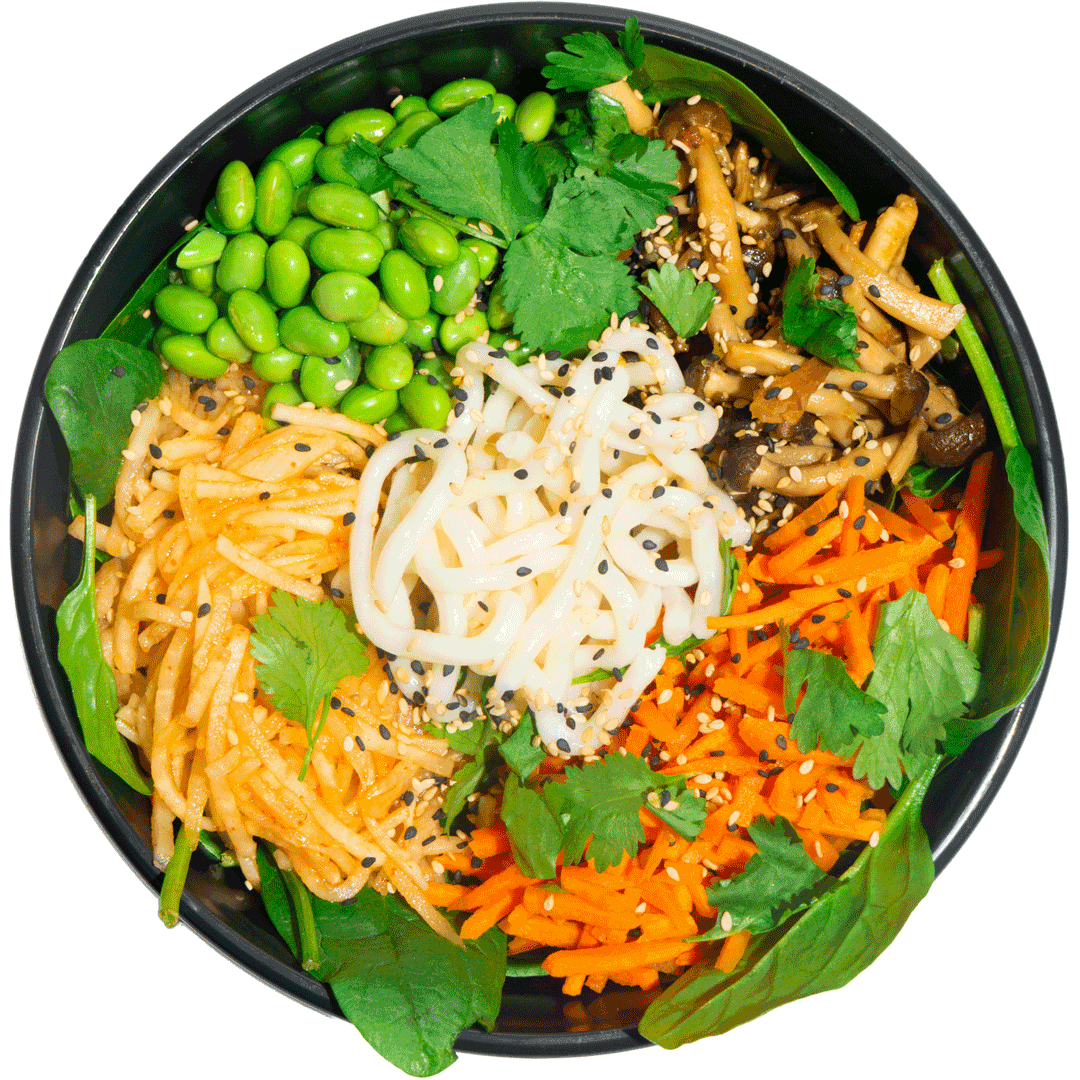 Karottenstift, Miso-Buchenpilz, Edamame, Sesam-Mix, Koriander, Kohlrabisalat, Babyspinat, Udon-Nudel