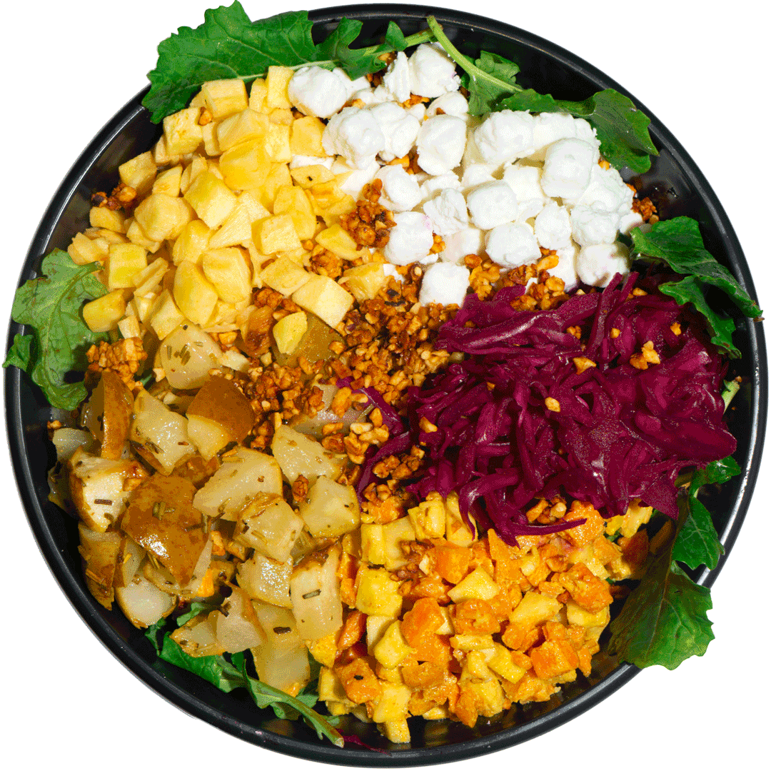 mit planted.kebab, Cranberry-Rotkohl, Kirschtomaten, Gurken, eingelegten roten Zwiebeln, Granatapfelkern, gerösteten Rosmarin-Kartoffeln und gemischtem Blattsalat