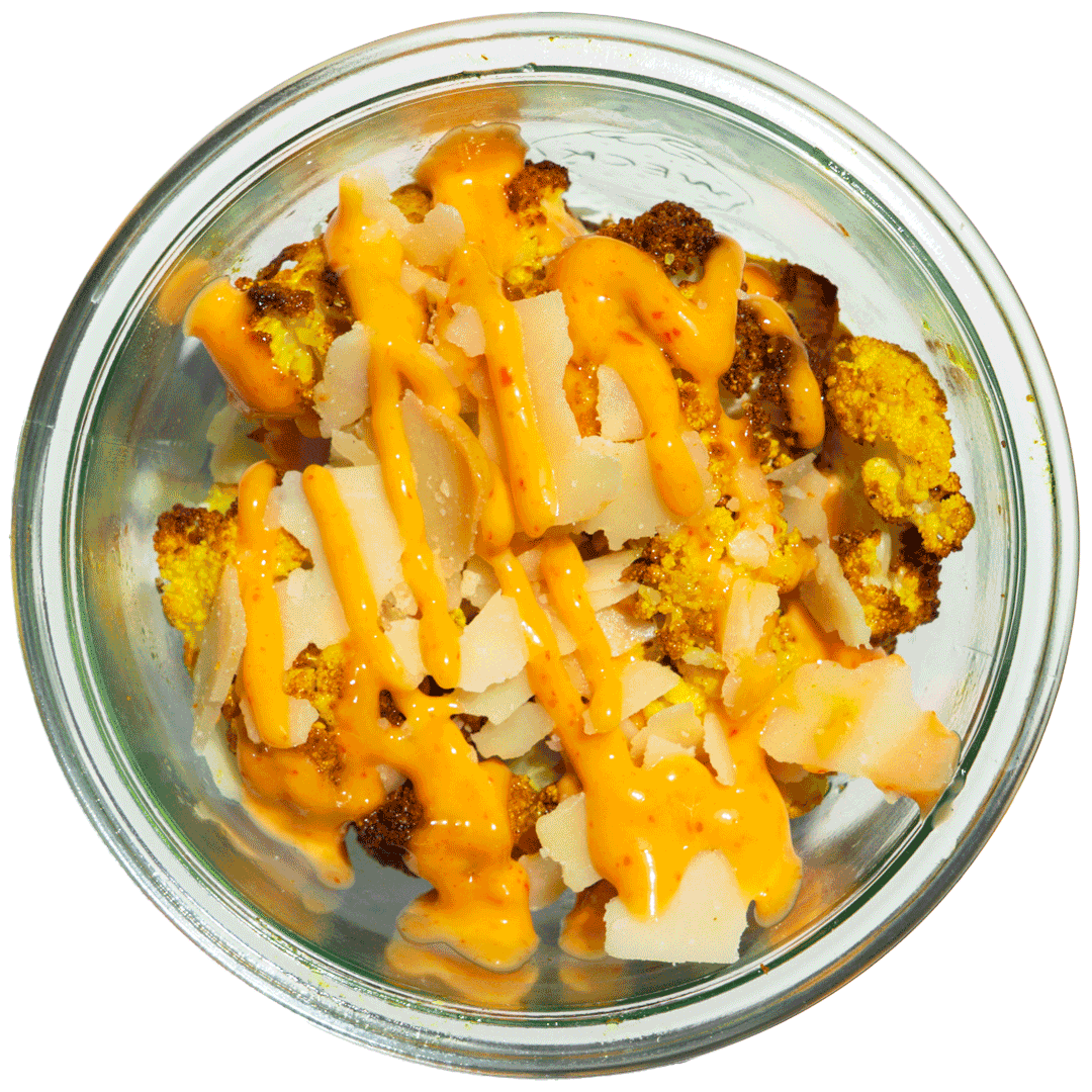 Curry-Blumenkohl, italienischer Hartkäse, Sriracha Mayo