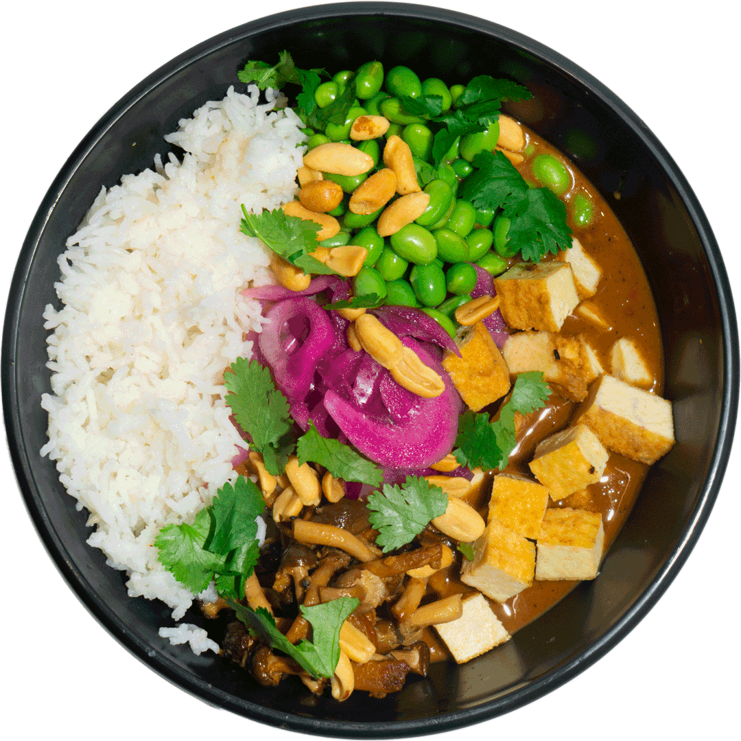 Bio-Tofu in Erdnusssauce, Edamame, rote Zwiebel, Miso-Buchenpilz, geröstete Erdnuss, Basmatireis, Koriander