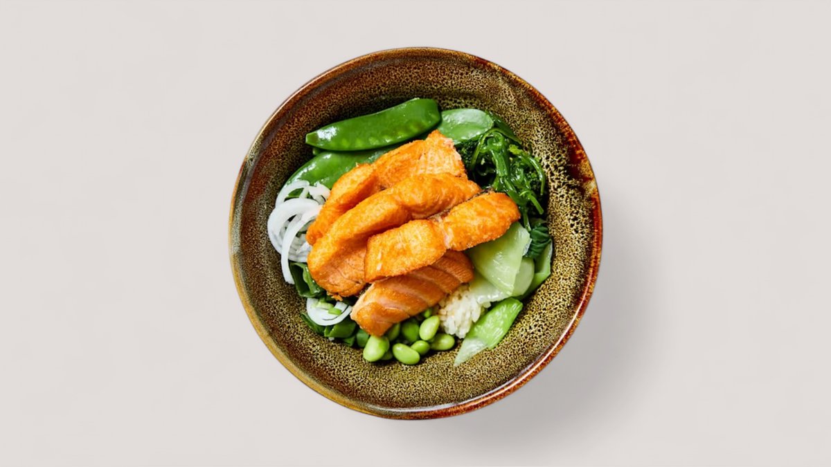 alle Gerichte werden mit Reis, Avocado, Edamame, eingelegtem Rettich, Sesam, Blattspinat, Seetang, Pak Choi, Gurken und einer Zutat deiner Wahl zubereitet