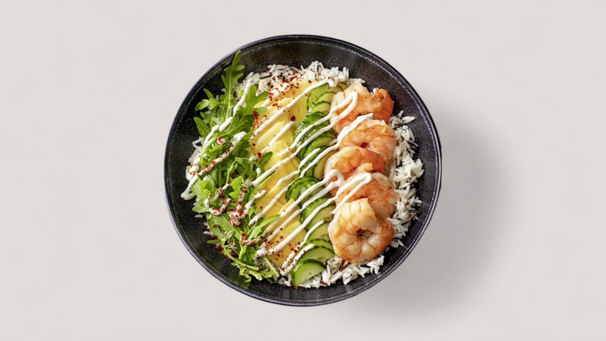 alle Bowls werden mit Reis, gegrillten Scampi, Avocado, Edamame, eingelegtem Rettich, Sesam, Blattspinat, Seetang, Pak Choi und Gurken zubereitet