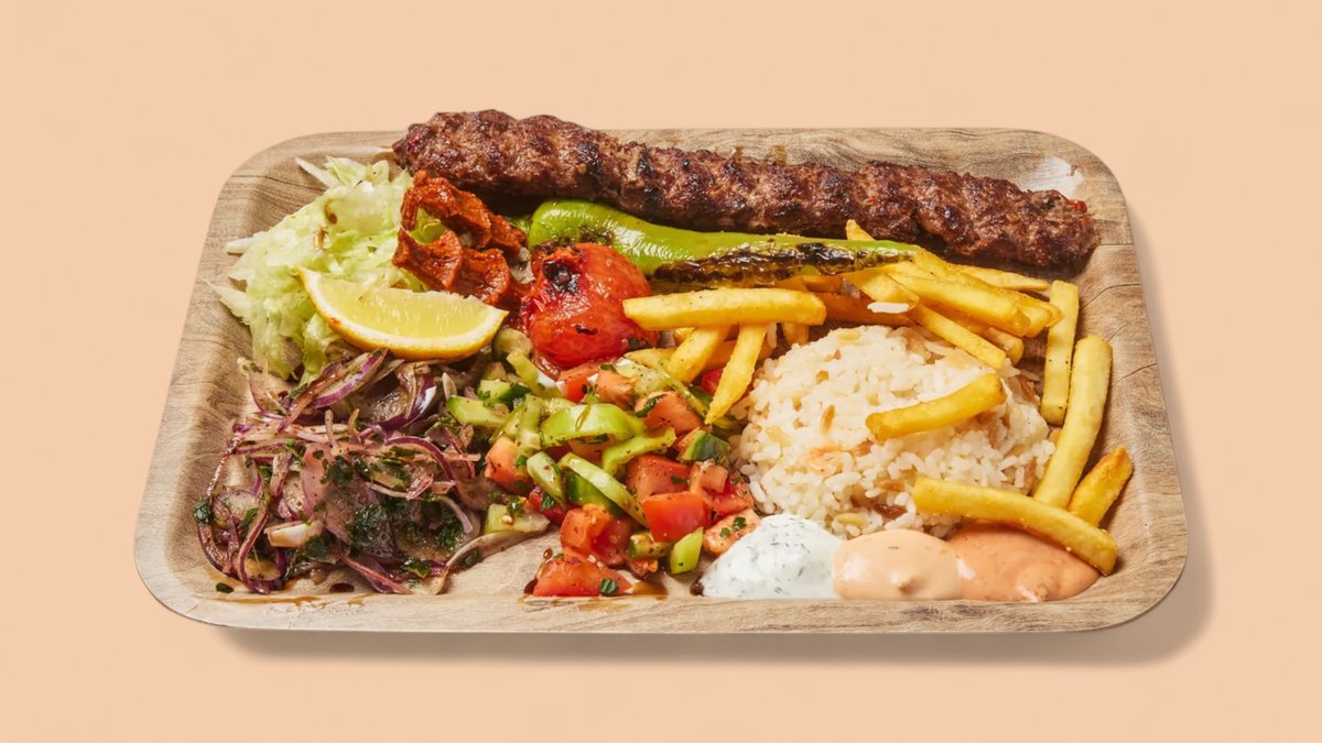 Saftig gegrillter Rinderhackspieß, serviert mit türkischem Pilav Reis oder knusprigen Pommes Frites, frischer Zwiebelsalat mit Sumach, Tomaten-Gurkensalat mit gegrilltem Gemüse und täglich frisch gebackenem Lavashbrot. Ein authentisches Geschmackserlebnis aus Hatay.