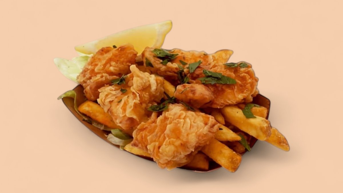 Hausgemachte Knusprige Hähnchenbites, frisch frittiert und serviert mit goldgelben Pommes Frites. Herzhaft, sättigend und perfekt zum Snacken.