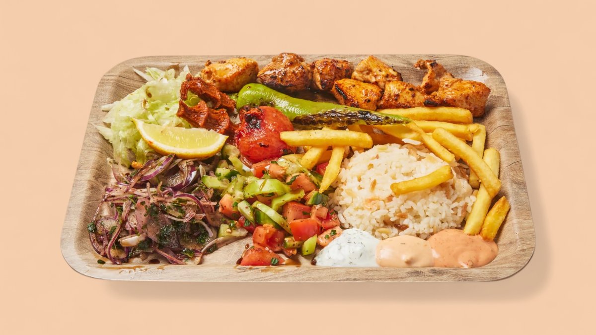 Zart gegrillte, speziell marinierte Hähnchenspieße, serviert mit türkischem Pilav Reis oder knusprigen Pommes Frites, frischem Zwiebelsalat mit Sumach, Tomaten-Gurkensalat, gegrilltem Gemüse und täglich frisch gebackenem Lavashbrot. Ein authentisches Geschmackserlebnis aus Hatay.