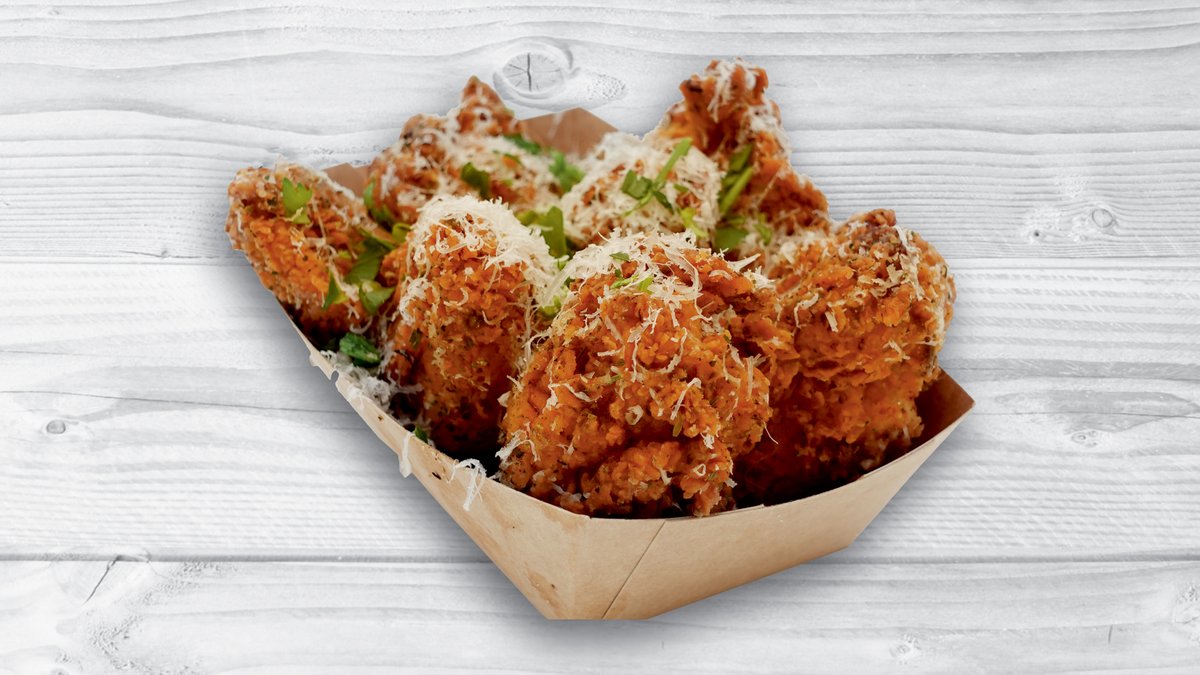 knusprige Hühnerflügel mit gewürzen aus der Region Hatay, verfeinert mit Knoblauch und Parmesan