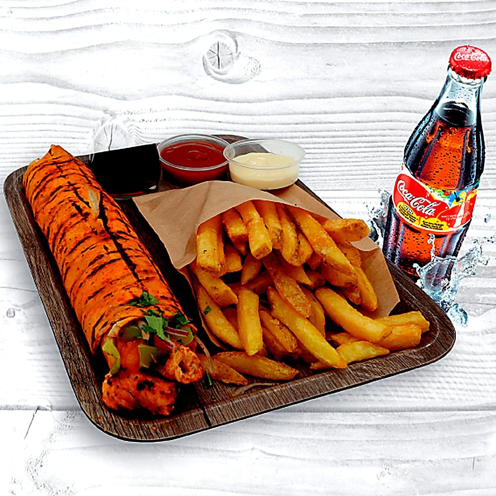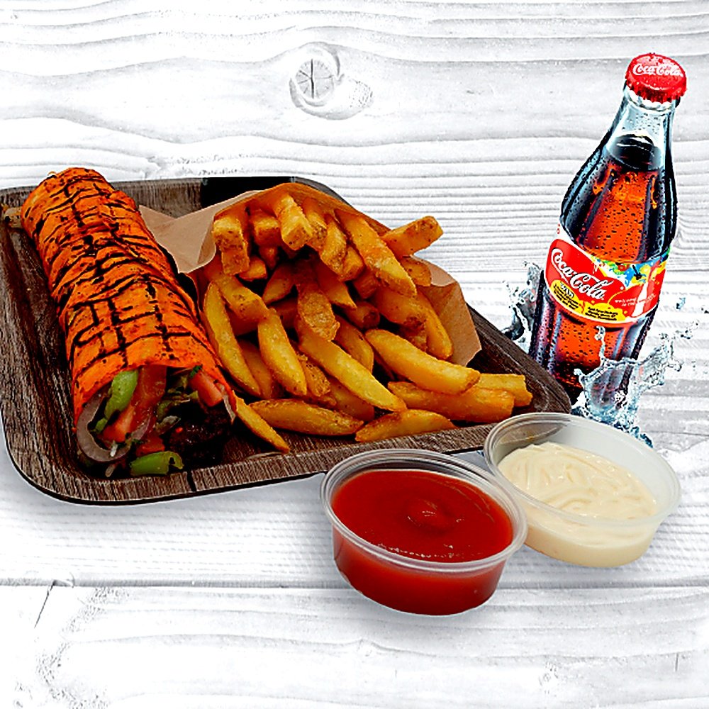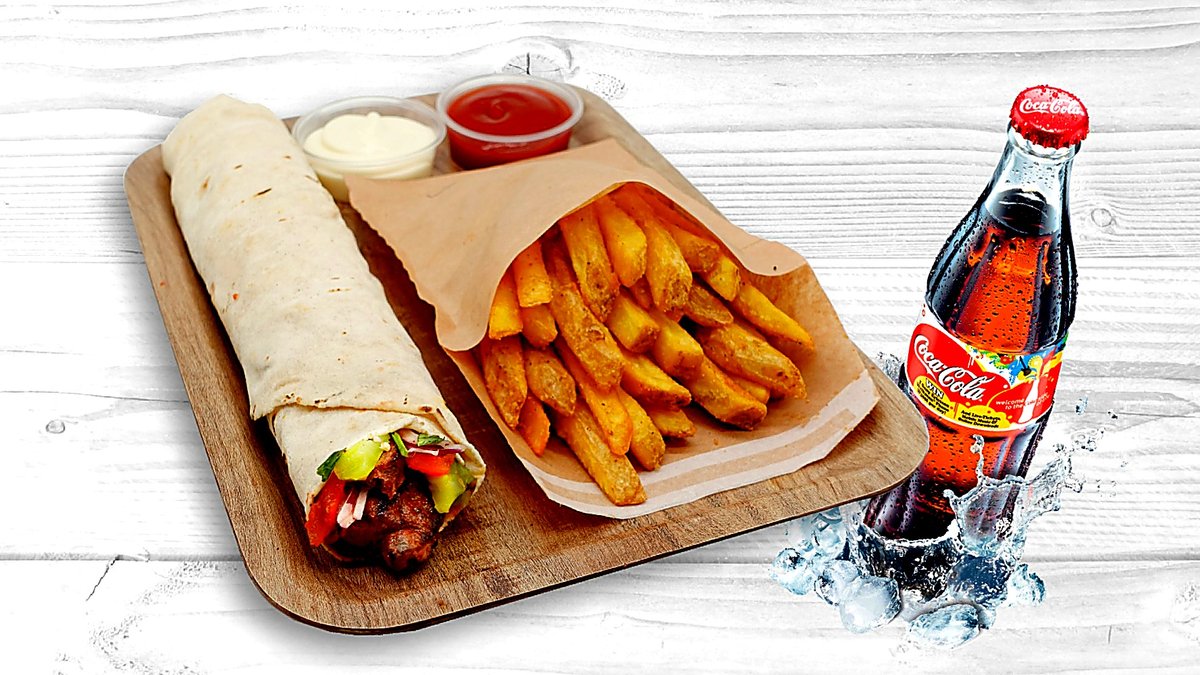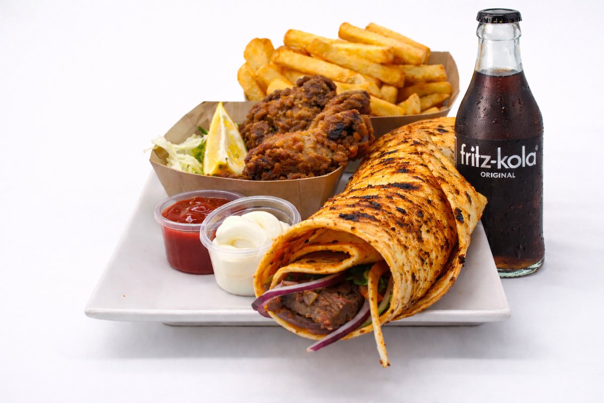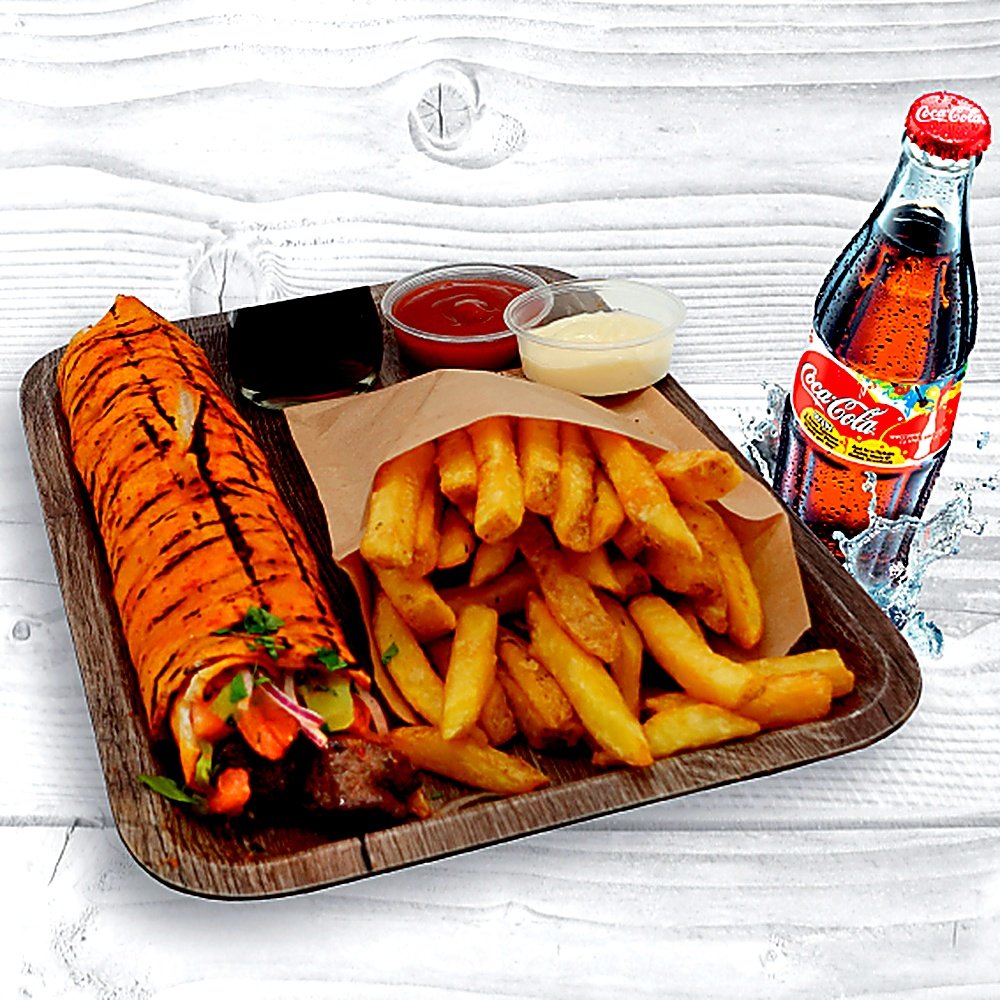 Ein frisch gegrillter Hatay Dürüm, serviert mit knusprigen Pommes Frites und einem Erfrischungsgetränk nach Wahl. Ein sättigendes Menü mit authentischem Geschmack aus Hatay.
