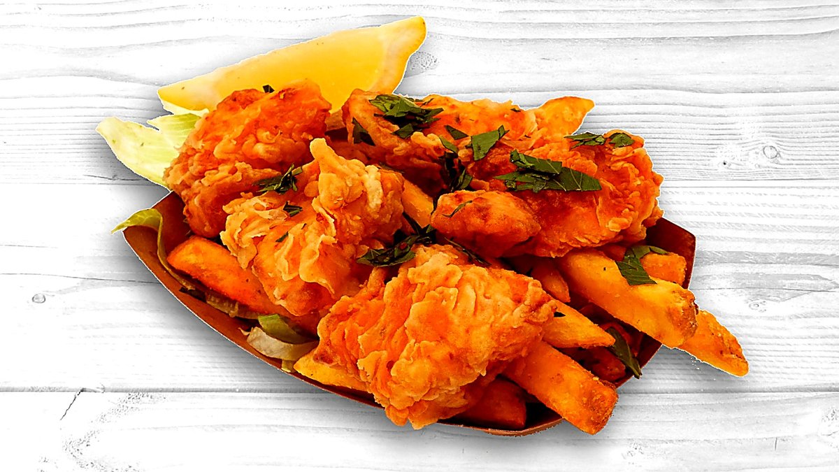 Sechs hausgemachte knusprige Rindfleischbites, frisch frittiert und serviert mit goldgelben Pommes Frites. Herzhaft und perfekt für Fleischliebhaber.