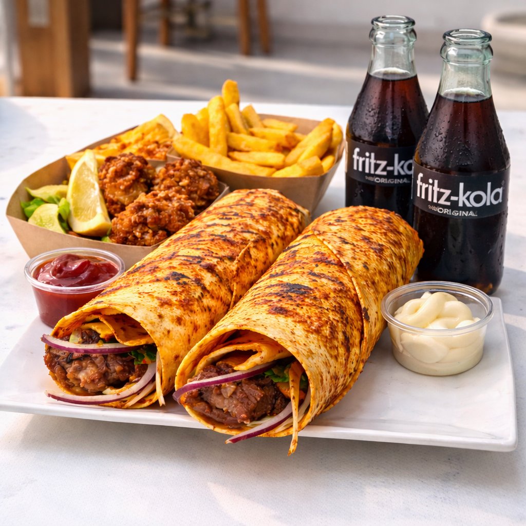 Ein starkes Menü zum Teilen. 2 originale Hatay Dürüm, dazu knusprige Hähnchenteile, eine große Portion Pommes sowie Ketchup und Mayonnaise. Serviert mit 2 Flaschen Fritz-Kola – perfekt für den gemeinsamen Genuss.