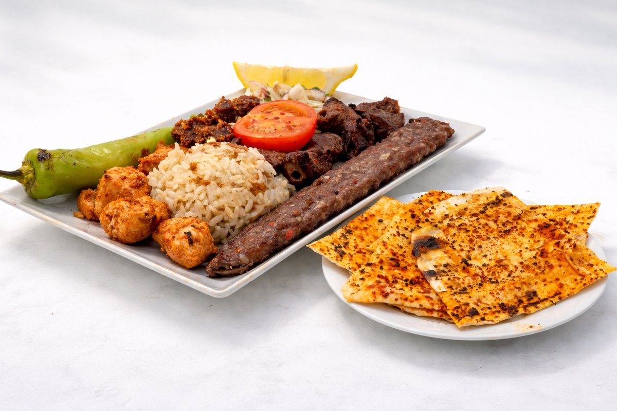 Gemischter Grillteller mit Hatay Kebab,Rinderstückspieß, gegrillten Hähnchenstücken und verschiedenen Fleischsorten vom Grill. Dazu frische Çiğköfte, Butterreis, gegrillte Peperoni, frische Garnitur mit Zwiebeln, Tomaten und Zitrone. Serviert mit knusprigem, gewürztem Fladenbrot (Lavaş). Reichhaltig, sättigend und voller original Hatay-Geschmack.