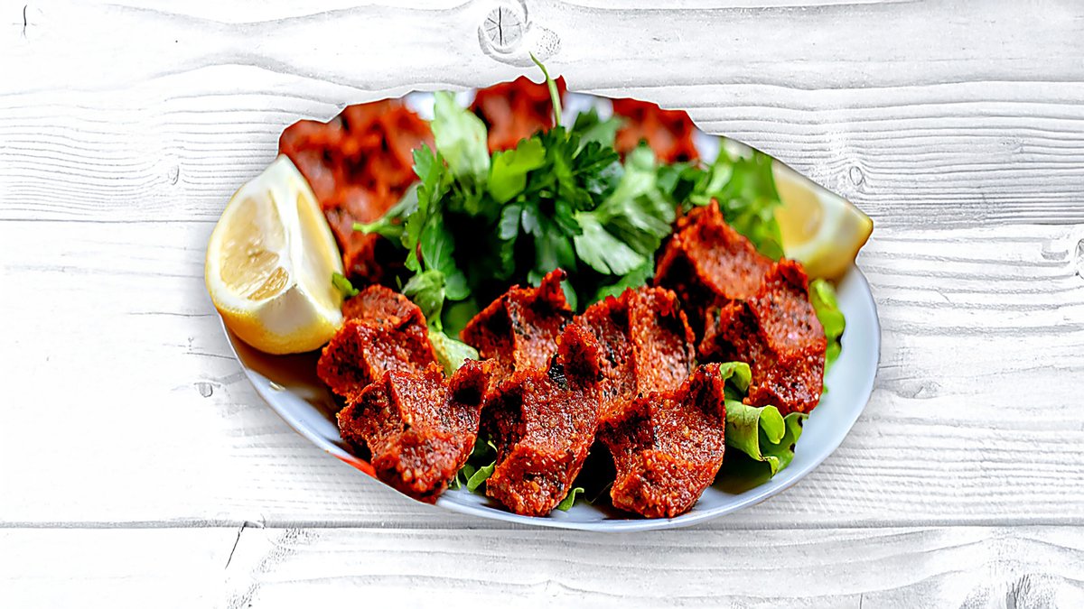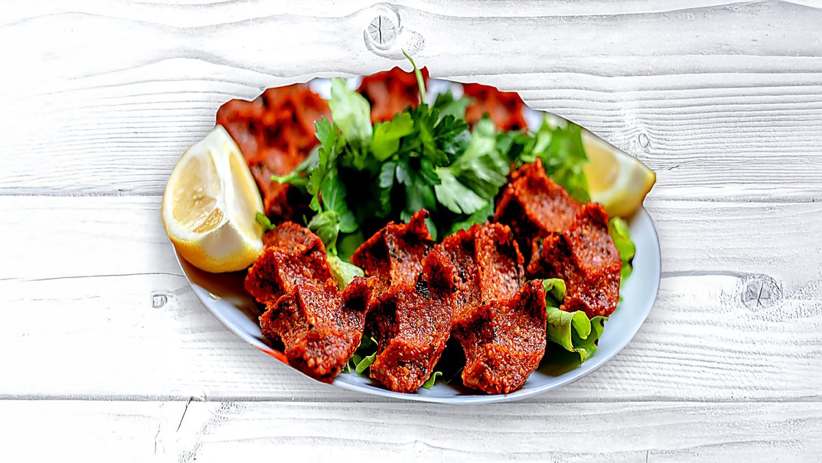 Frisch zubereitete vegane Köfte aus Bulgur, fein gewürzt mit typischen Hatay-Gewürzen. Serviert mit frischem Eisbergsalat, Tomaten, Granatapfelsoße, Zitrone ein authentischer Genuss, frisch, leicht und aromatisch.