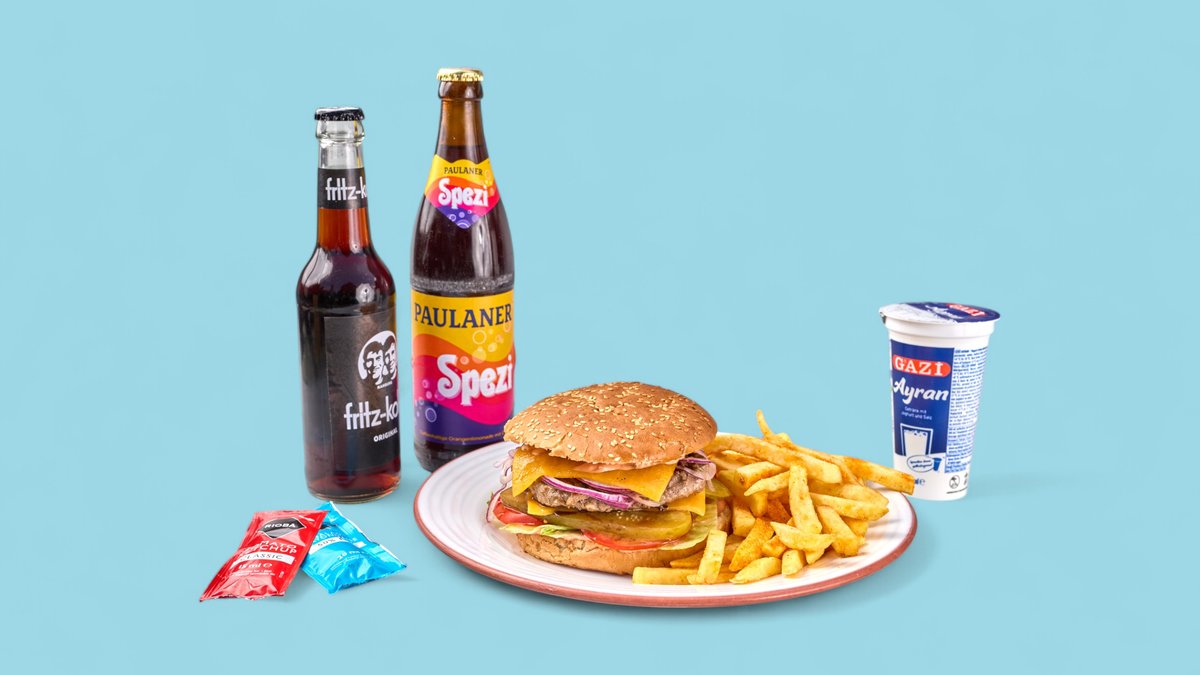 1x Burger 1x Pommes frites 1x alkoholfreies Getränk nach Wahl