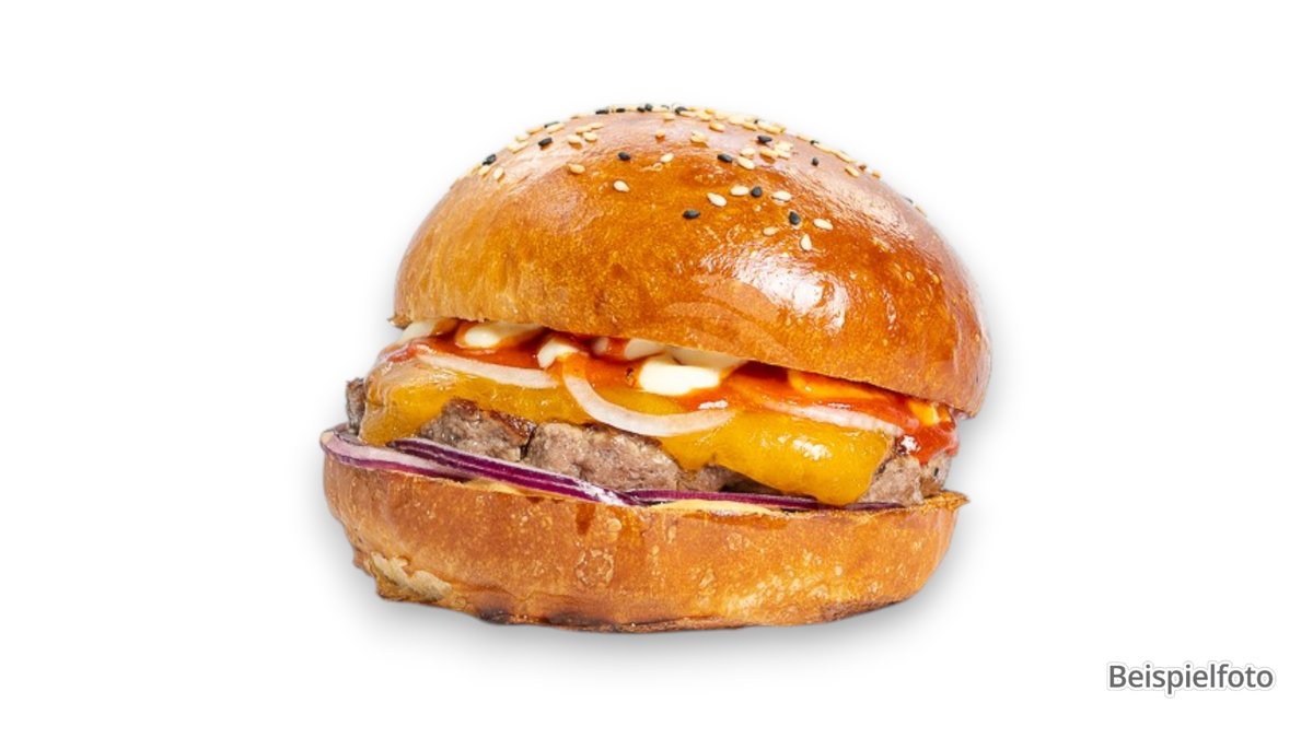 mit Rindfleischpatty (ca. 150 g), Käse, Zwiebelringen, Röstzwiebeln, Grillsoße und Mayonnaise in Hamburgersemmel