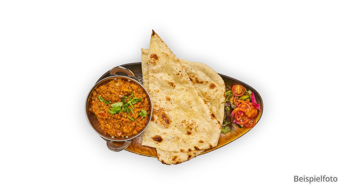 mit gekochtem Lammfleisch in scharfer Tomaten-Linsensoße auf Chapatibrot mit marinierten Zwiebeln und frischem Koriander