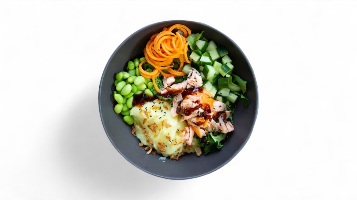 Hähnchen, Teriyaki Sauce, Edamame, Gurken, Karotten geröstetes Sesam Dressing, schwarze Sesamkerne