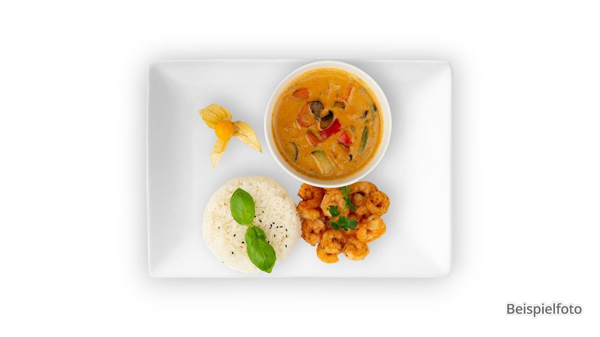 Riesengarnelen mit Gemüse in That-Rot-Curry und Kokosmilch