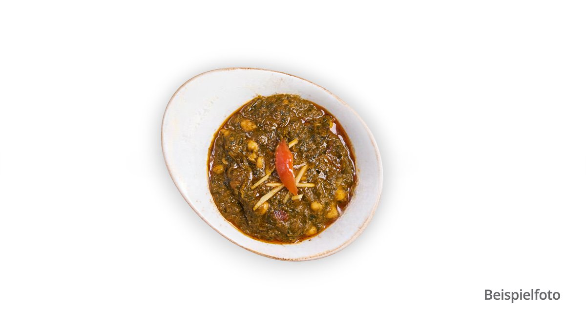 scharf zartes Lammfleisch mit Koriander, Spinat, grünem Chili, Minze, in orientalischer Soße und Kokosmilch