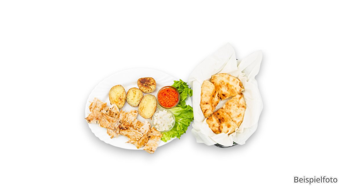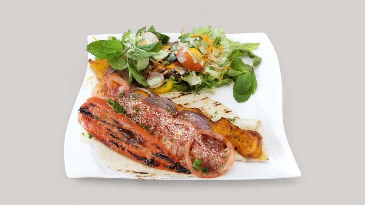 für 2-3 Personen Lammspieß, Hähnchenspieß, Lammkotlett und Hackfleisch-spieß mariniert und gegrillt, dazu Gartensalat mit hausgemachtem Salatdressing und afghanischem Fladenbrot