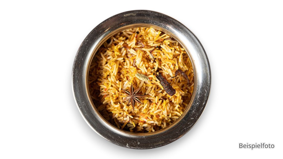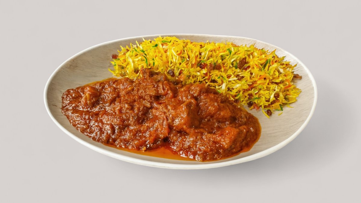 leicht pikant kleine Kalbfleisch Stückchen in einer würzigen Ingewer-Knoblauch-Tomatensoße, Kurkuma, Paprika, Zwiebeln, brauner Basmatireis , Rosinen und Karottenstreifen in der Lammfleischbrühe gedämpft