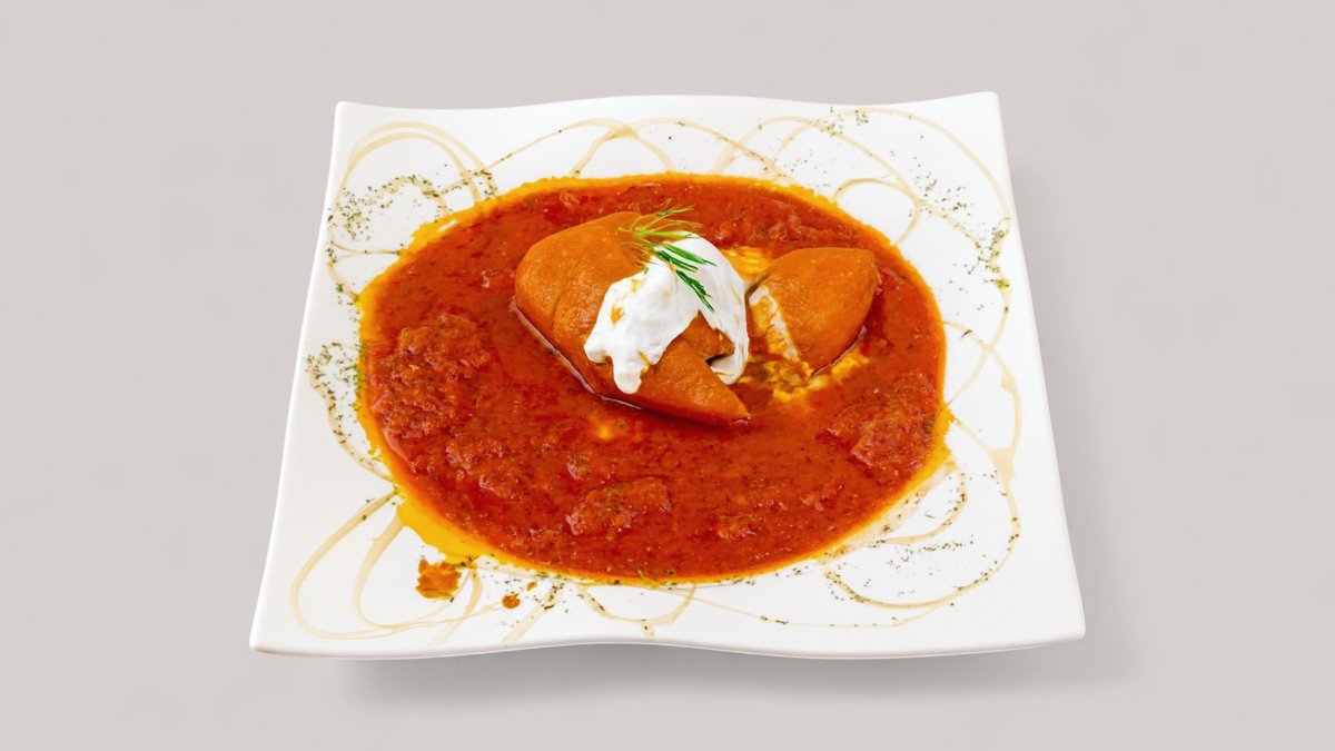 kleine Teigtaschen gedünstet, gefüllt mit Porree, überzogen mit pikanter Quark-Hackfleischsoße