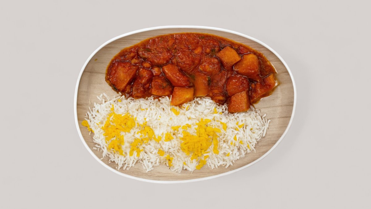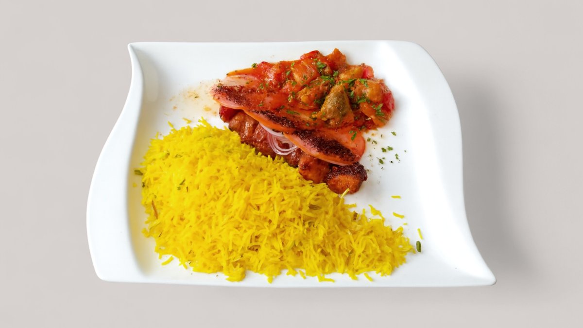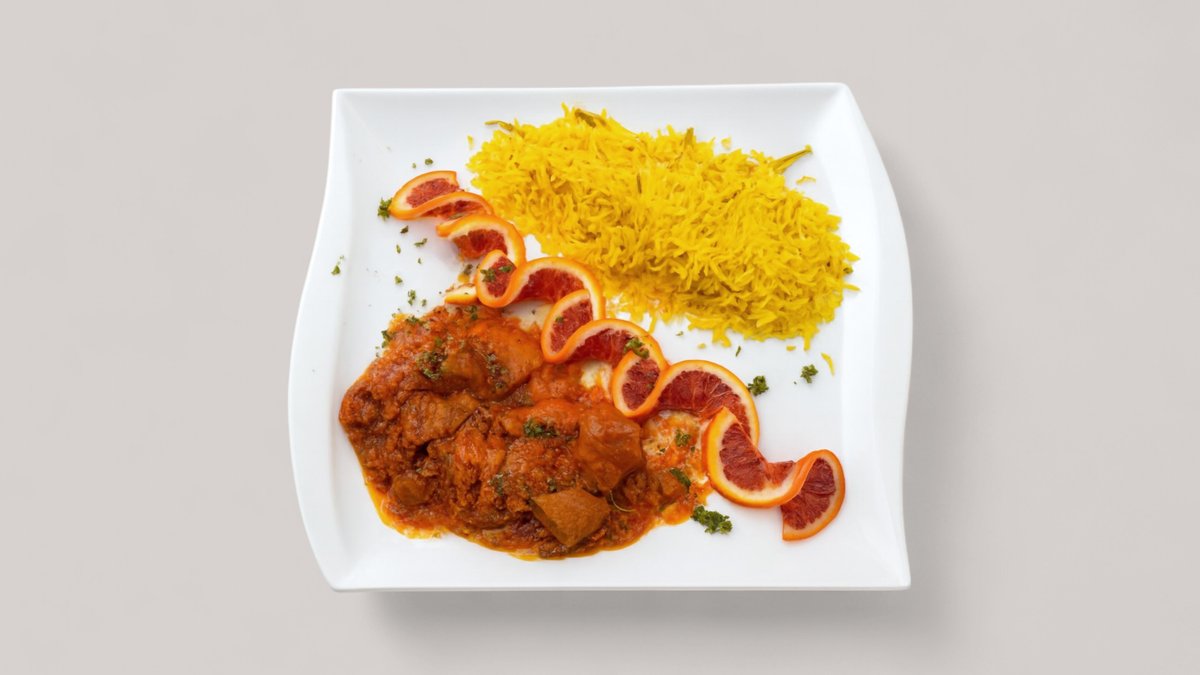 leicht pikant kleine Kalbfleisch Stückchen in einer würzigen Aprikosensoße, dazu Sieben verschiedene Reisfarben mit Mandeln, Pistazien, Rosenwasser, Rosinen, Kardamom, Kürbiskernen, Berberitzen und Safran