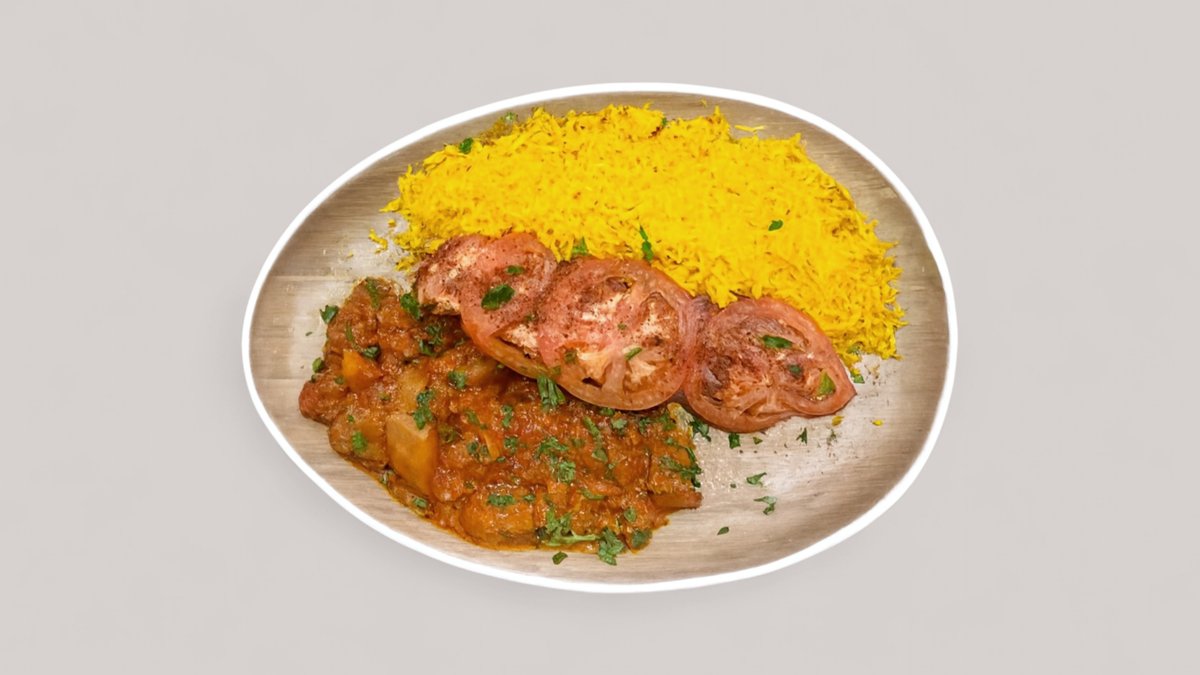 Kartoffeln in pikanter Soße, dazu weiß gebackener Basmatireis