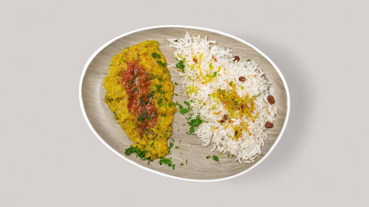 feiner Basmatireis gedämpft mit Karottenstreifen, Safran, Rosinen, Mandeln, Pistazien, dazu Hähnchenfleisch in einer Linsensoße