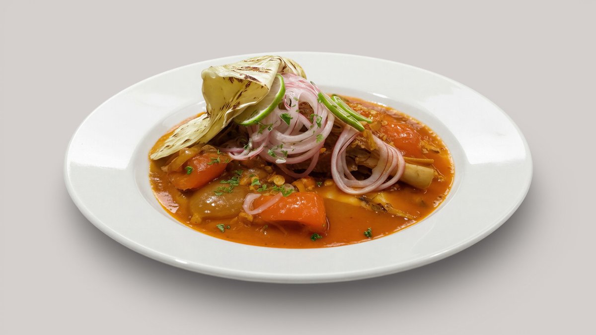 scharf Lammhaxe gekocht in einer scharfen Paprika-Linsensoße, dazu marinierte Zwiebeln und Fladenbrot