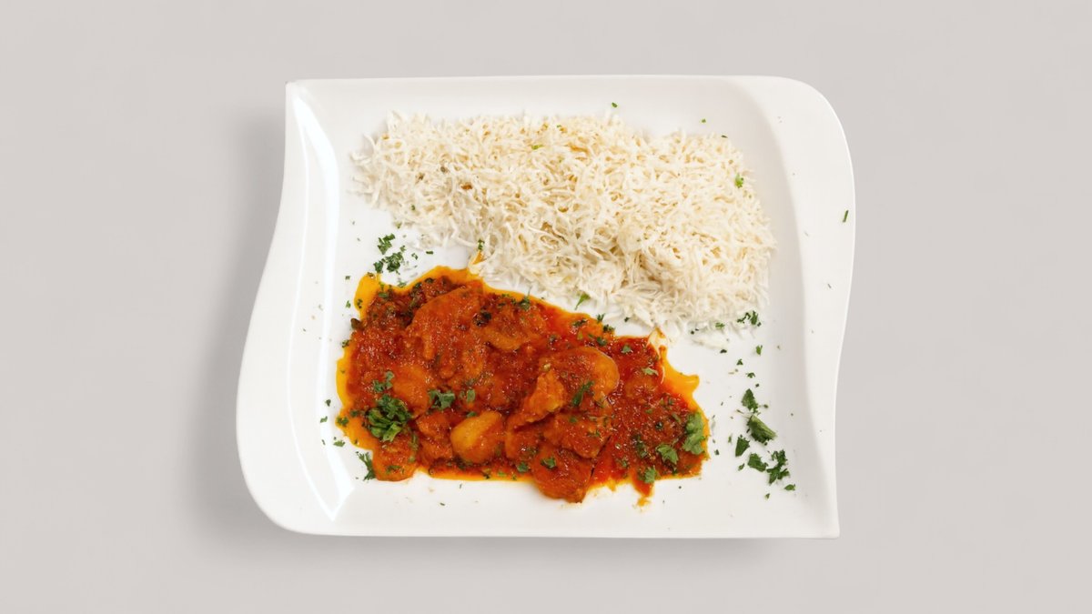 Lammfleisch mit einer pikanten Kartoffel-Ingwersoße mit frischem Koriander, Kurkuma, Knoblauch, Tomatensoße, dazu weiß gebackener Basmatireis