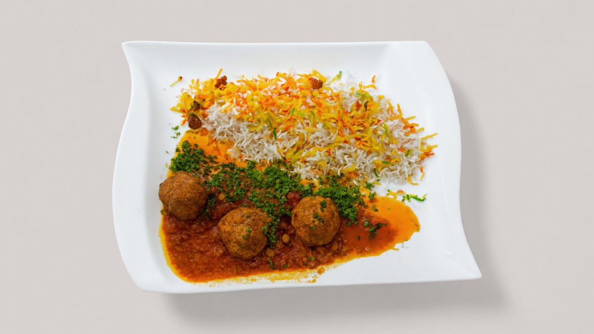 Hackfleischbällchen gekocht in einer Pflaumen-Linsensoße, dazu weiß gebackener Basmatireis