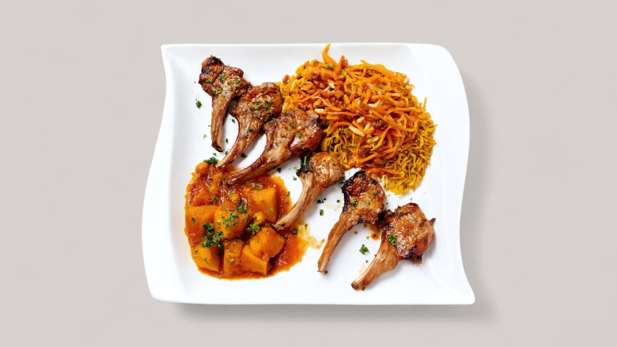 Lammhaxe, dazu Sieben verschiedene Reisfarben mit Mandeln, Pistazien, Rosenwasser, Rosinen, Kardamom, Kürbiskernen, Berberitzen und Safran