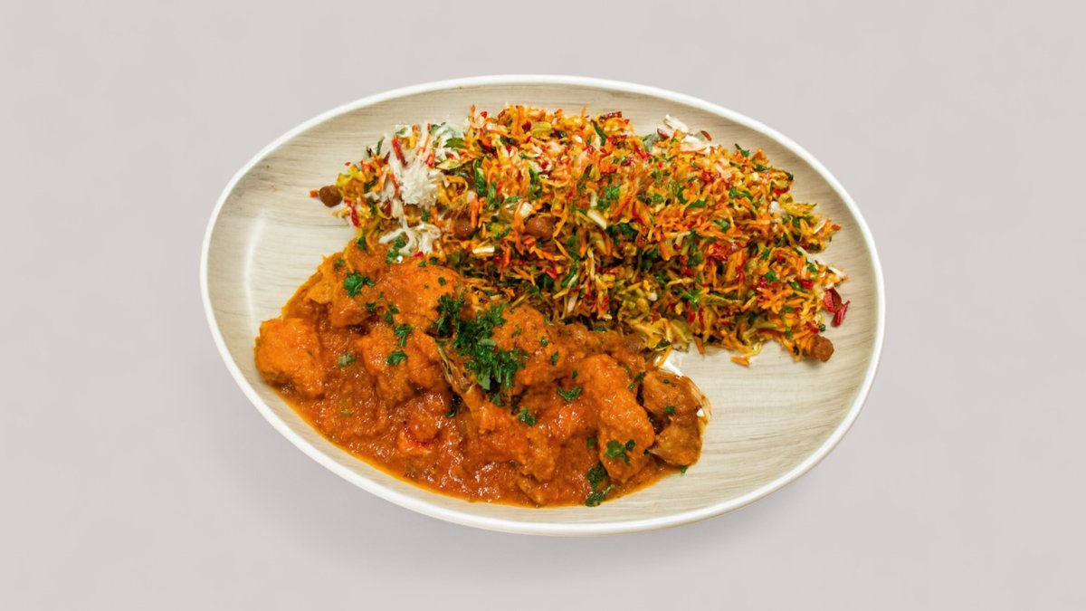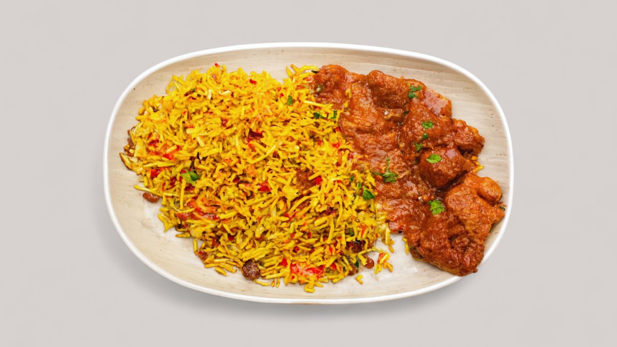 leicht pikant kleine Kalbfleisch Stückchen in einer würzigen Ingewer-Knoblauch-Tomatensoße, Kurkuma, Paprika, Zwiebeln, dazu braun gebackener Basmatireis mit Rosinen, Pistazien und Karottenstreifen mit Mandeln Streifen