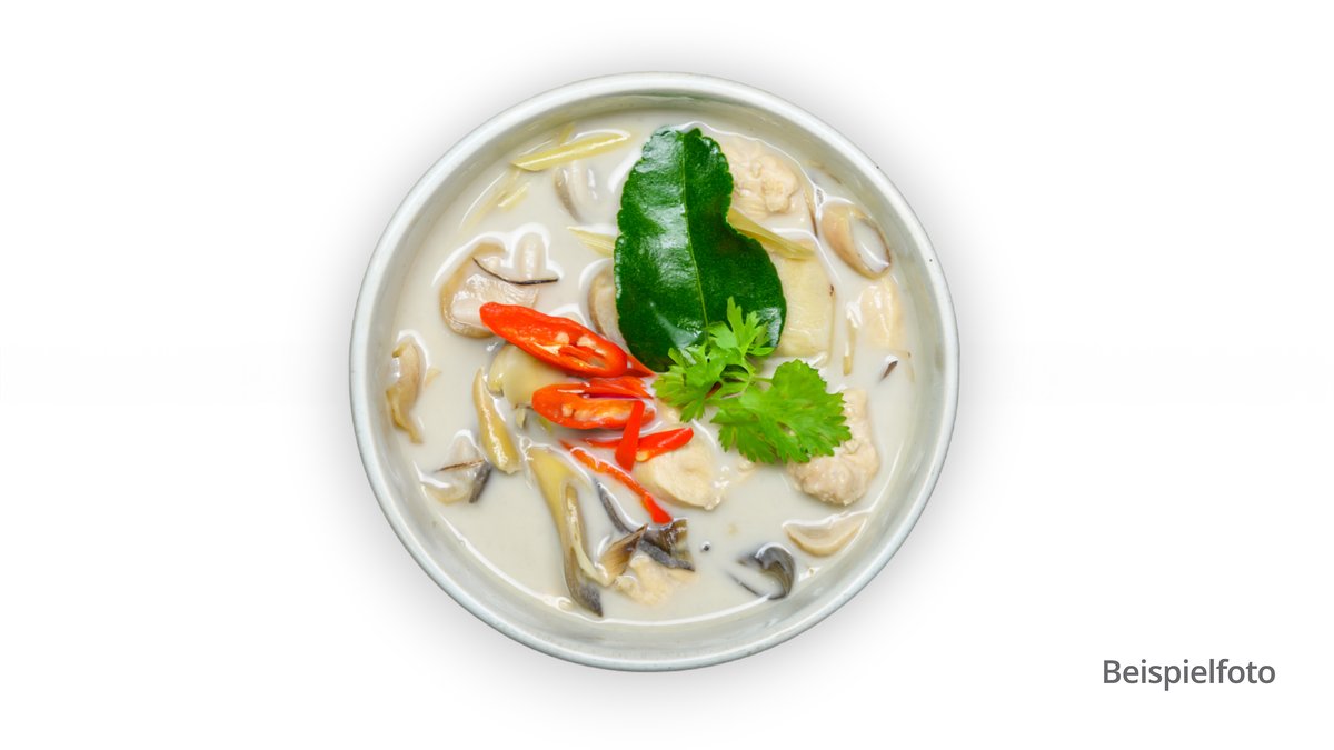 thailändische Suppe mit Kokosmilch, Pilzen, Chili, Zitronengrass, Limettenblätter, Koriander und einer Zutat deiner Wahl