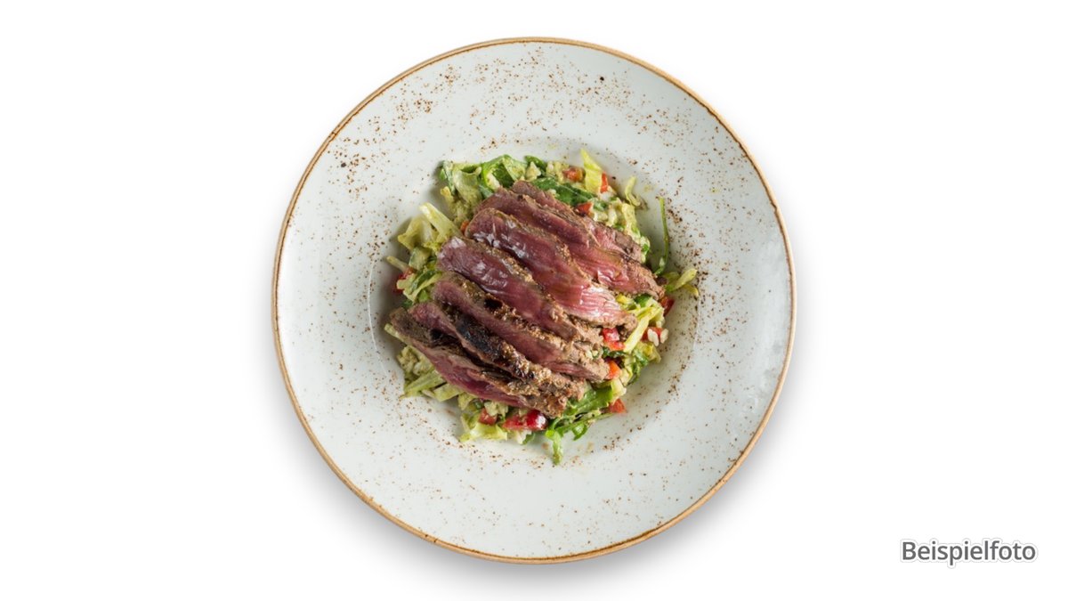 scharf angemacht mit Eisbergsalat, roten Zwiebeln, Paprika, Tomaten, frischen Kräutern und gebratenen Rinderstreifen